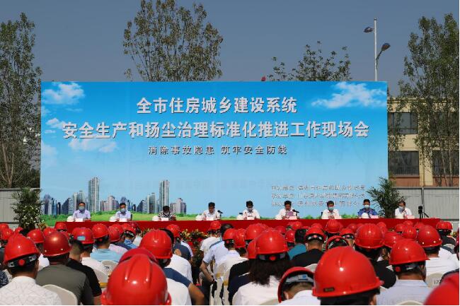 為了進一步提升我市房屋建筑工程安全防護、揚塵治理標準化和規范化水平,推動我市建筑企業安全防護和揚塵治理水平再上新臺階。6月20日,全市房屋建筑工程安全生產和揚塵治理標準化現場觀摩活動在山東濱州城建集團有限公司承建的民安鵲華苑工程施工現場舉行,活動圍繞2020年全國安全生產月——“消除事故隱患,筑牢安全防線”的主題,著眼當前全市住建領域的揚塵治理形勢,大力營造“人人重視安全、人人關注環?!钡牧己梅諊?,掀起安全生產和揚塵治理標準化工地的創建高潮。此次觀摩活動由濱州市住房和城鄉建設局主辦,山東濱州城建集團有限公司承辦,濱州民安置業有限公司協辦。市政府辦公室黨組成員辦公室副主任梅振鵬、市住房和城鄉建設局局長孫文利、市住房和城鄉建設局副局長張海濱、市城建服務中心副主任張樹林、濱城區住房和城鄉建設局局長張亮、開發區綜合執法局局長封涌波、濱州城建集團有限公司董事長曹慶訓、總經理孟慶國、濱州民安置業有限公司經理曹亮以及濱城區、開發區建設主管部門安全、揚塵管理機構負責人;市城建服務中心、市市政服務中心、市住建局建管質安科、人防工程科、開發中心、市質管站、綜合執法大隊、市安管站建筑工地揚塵治理包保片區人員;市本級、濱城區、開發區各房屋建筑工地項目經理。共計約220余人出席觀摩會。